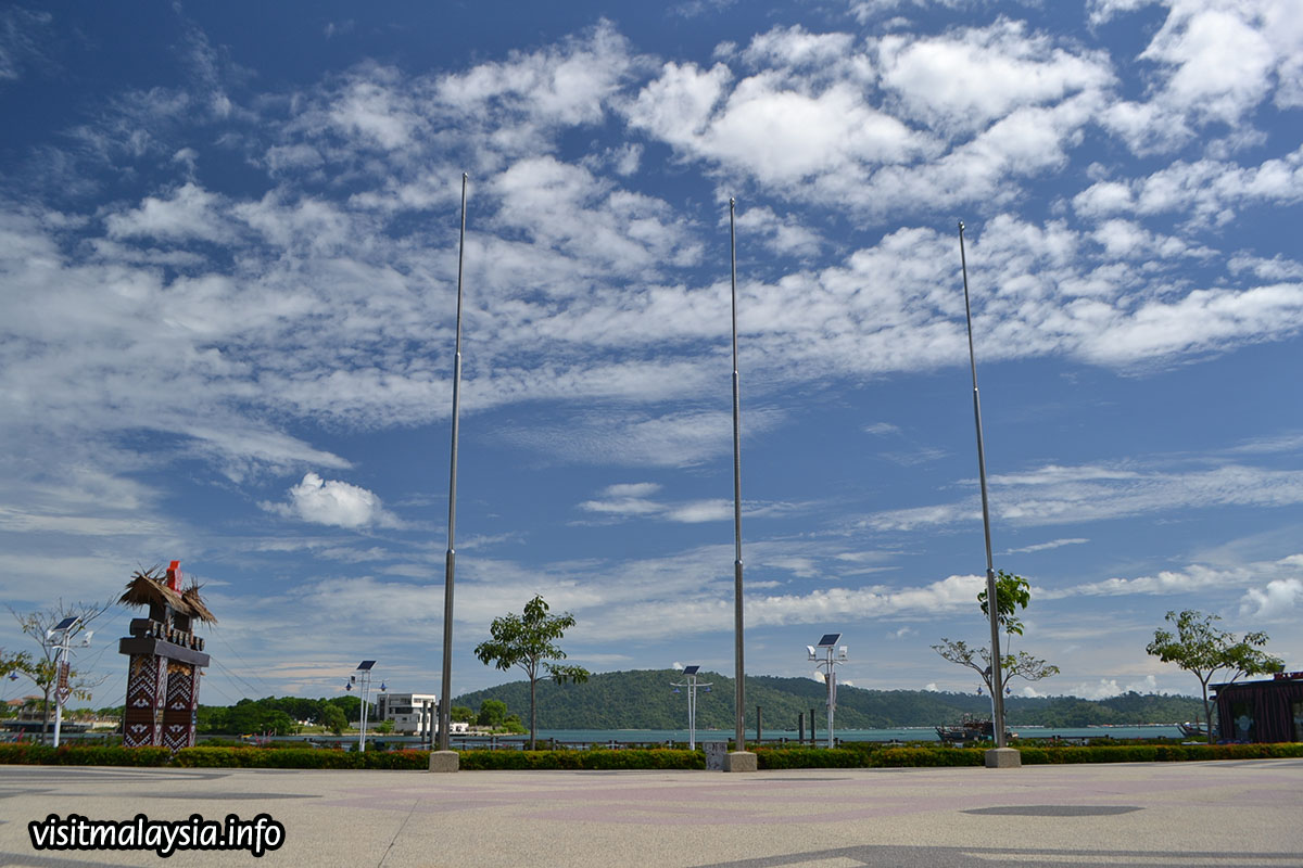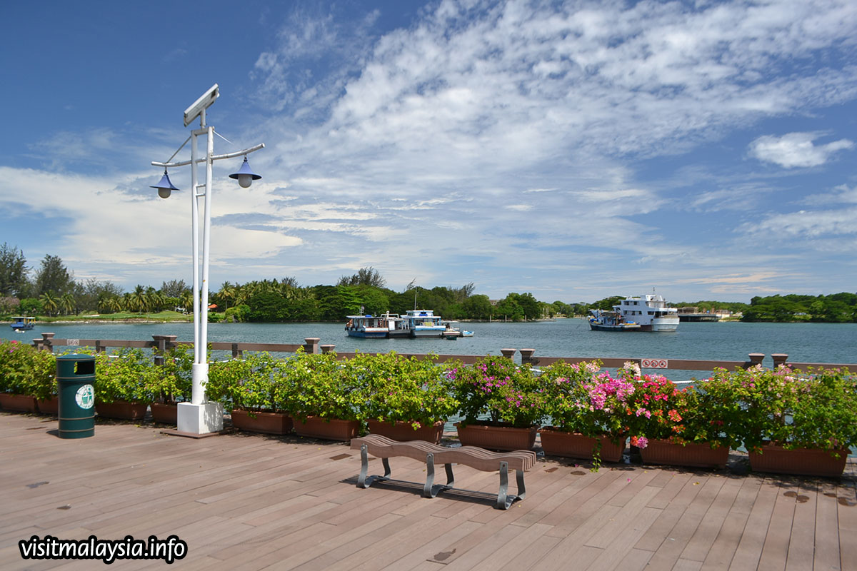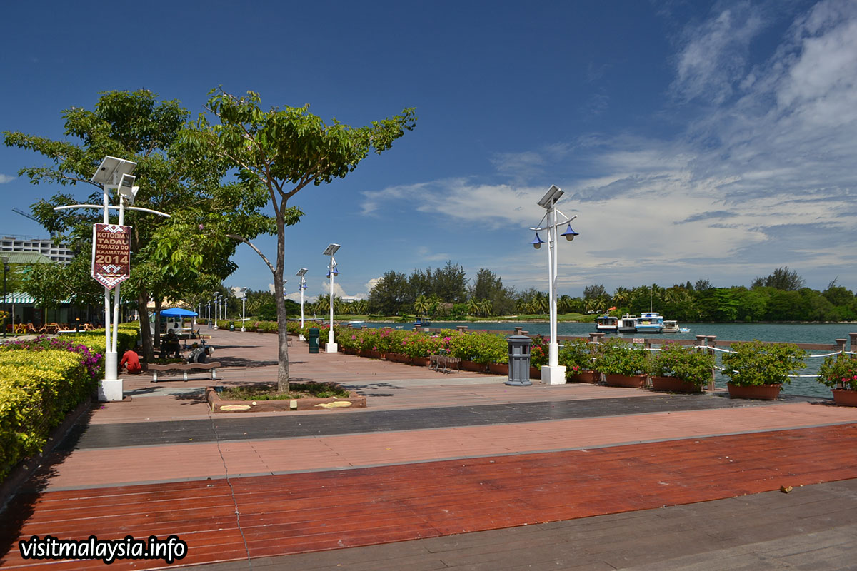 Anjung Senja is a flower-lined seafront walk that occupies west of the Waterfront, overlooking the sea and islands off KK City with a partial view of Sutera Harbour Resort at left. 'Anjung' which means porch, and 'Senja' (dusk) refers to the large hawker center erected along the esplanade that only opens completely in the evening.