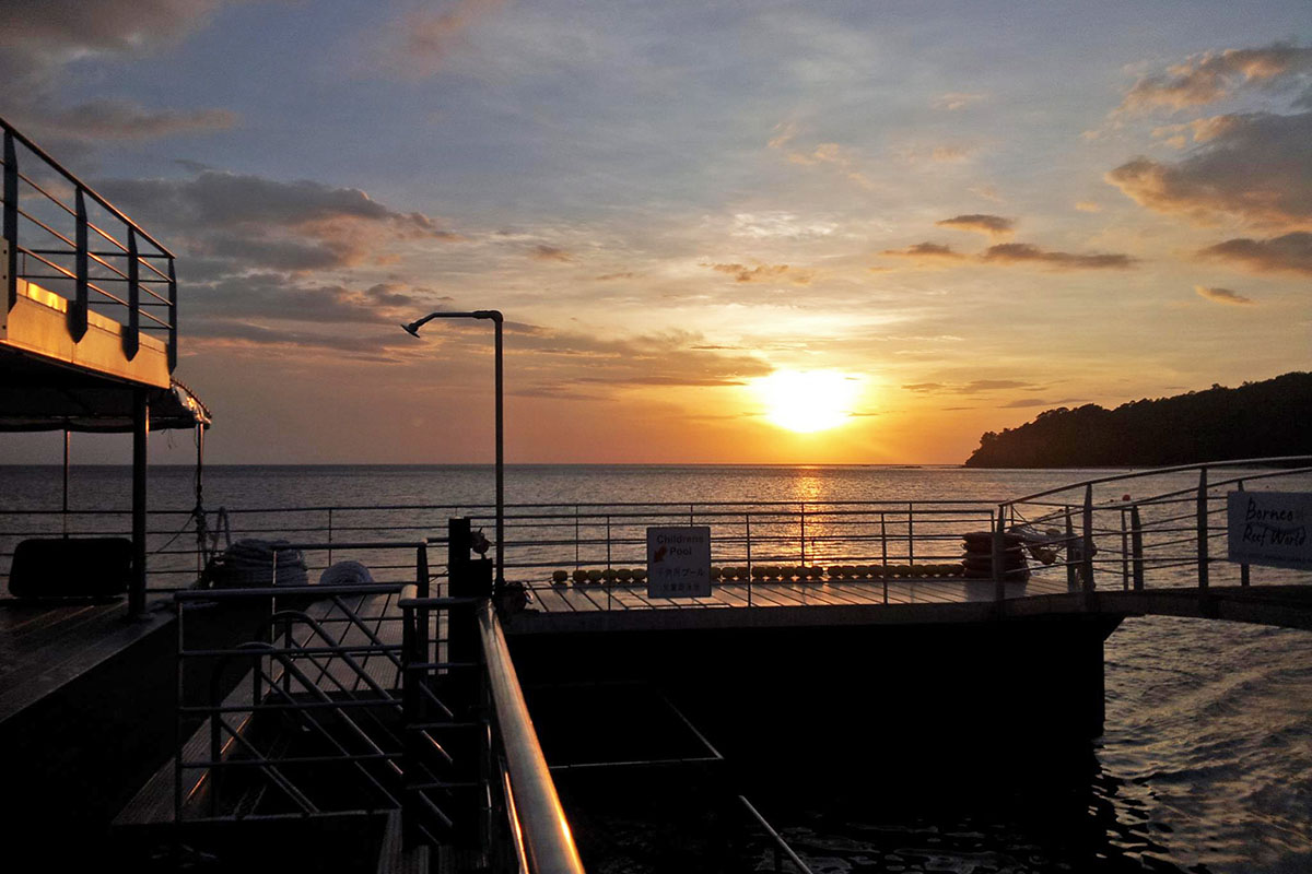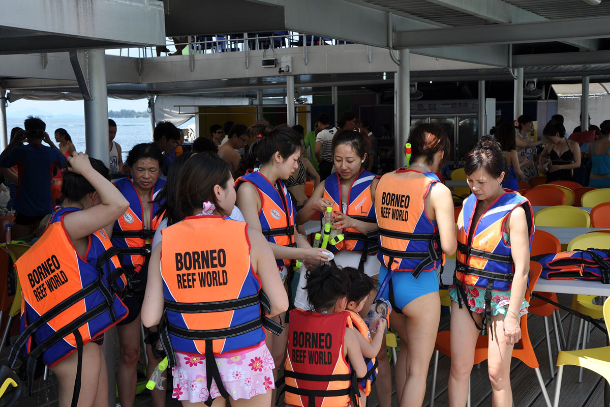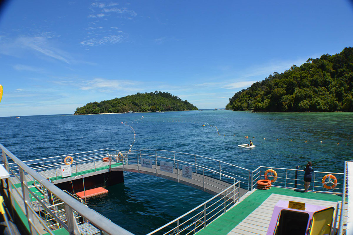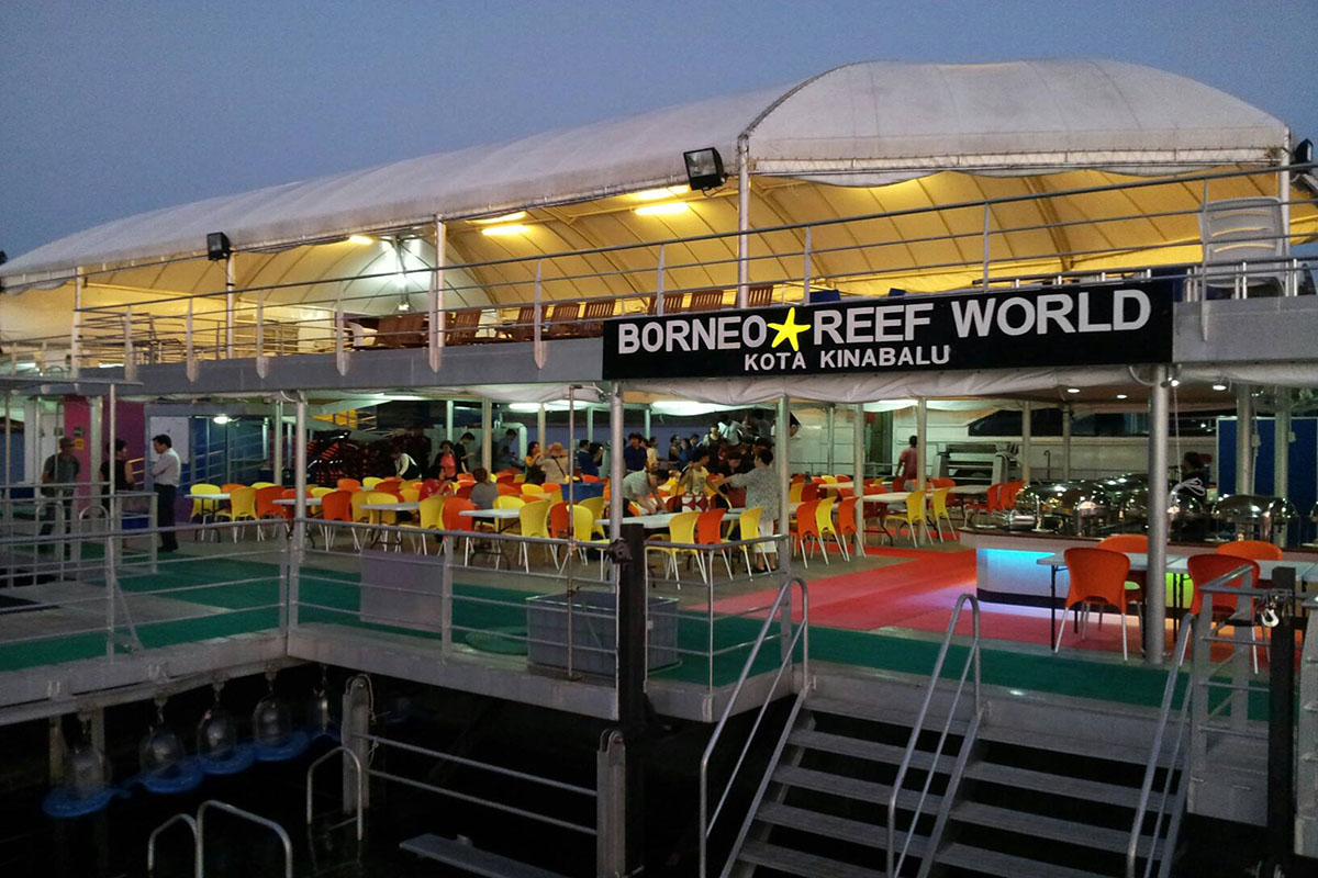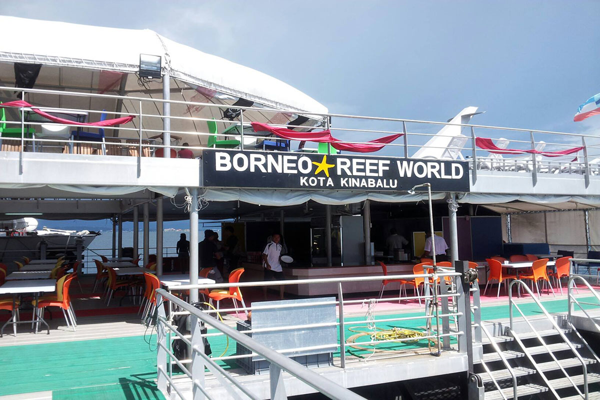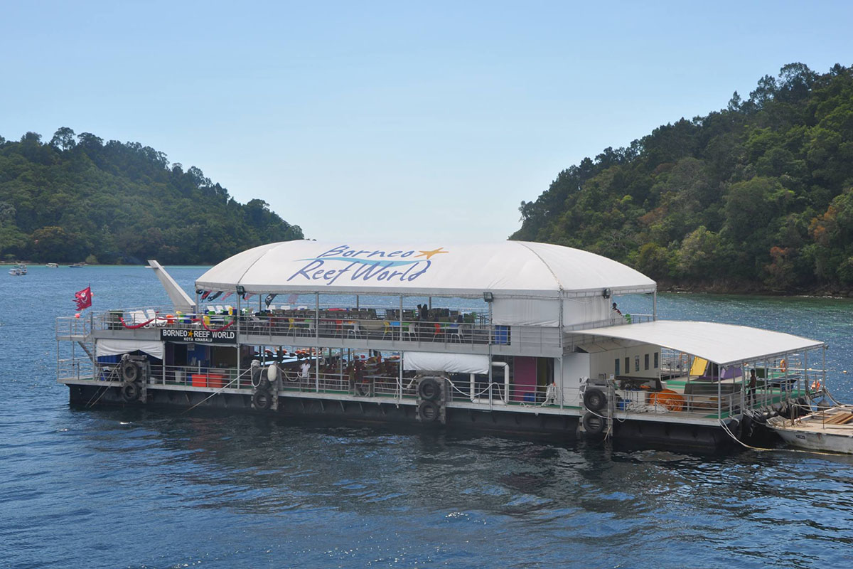 Borneo Reef World is a large pontoon moored between Pulau Gaya and Sapi Island off KK City, catering for tourists looking for alternative island-based activities at sea. Floating above a coral reef, the platform can accommodate up to 500 people and is divided into an upper and lower deck, with an underwater observatory below four meters down the surface.