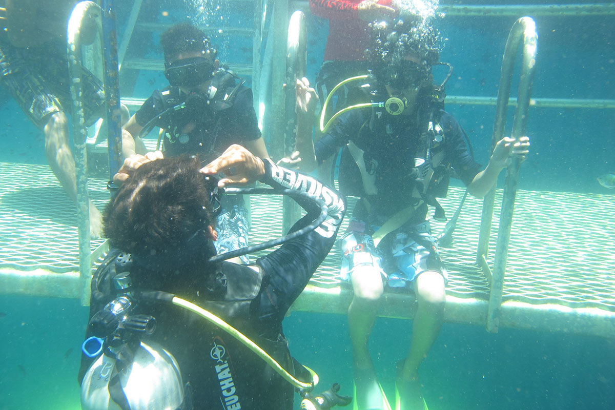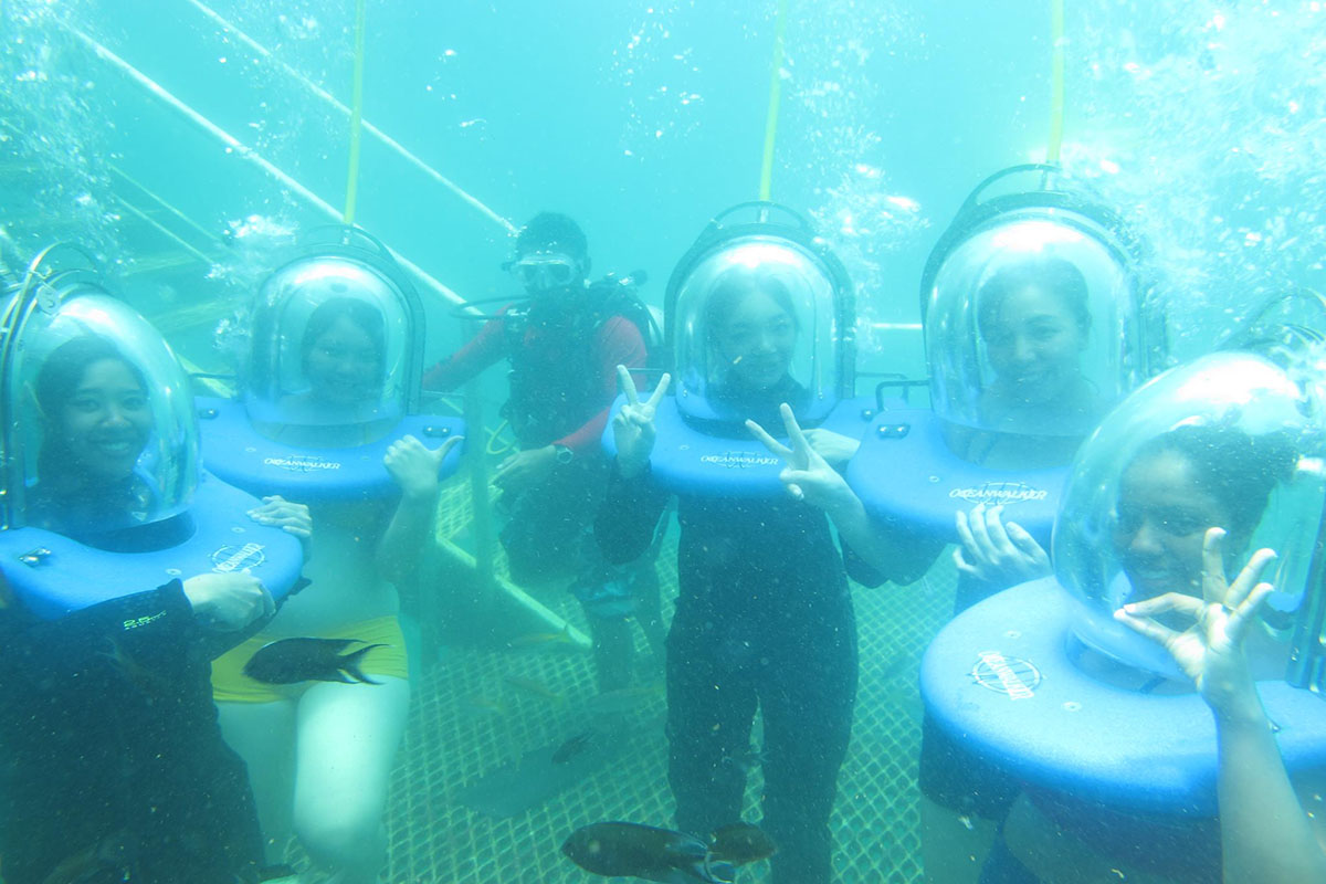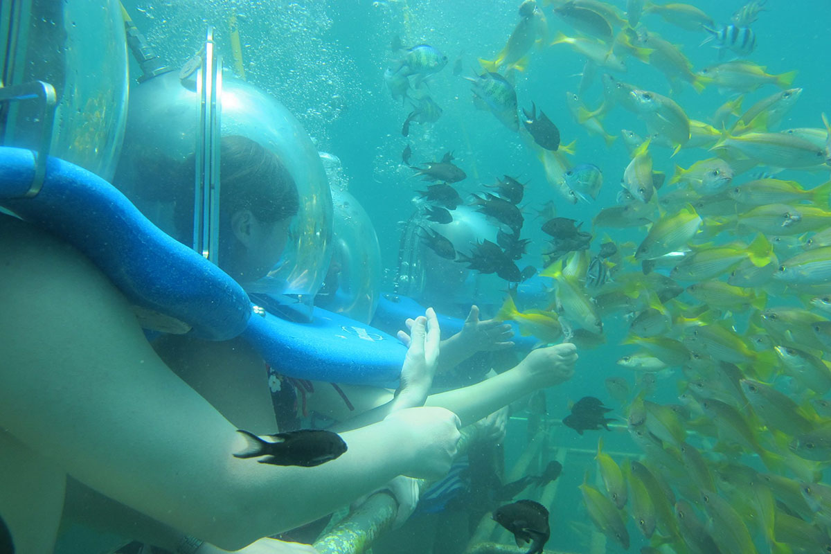 Here, visitors can view colourful fishes and the ocean bed in good visibility depending on weather. Another popular activity is 'Sea Walking', where guests are strapped in oxygen-fed helmets and given free run along a platform 5 meters under water (supervised by divers). Finally, there's the usual snorkelling and buffet lunch on the platform.